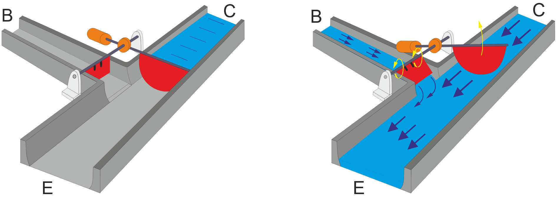 Der Transistor ist wohl das komplizierteste Bauteil hier. Er kann aber in diesem Rahmen und in den folgenden Schaltungen als elektrisch gesteuerter Schalter betrachtet werden. Die drei Beine werden als "Kollektor" , "Emitter" und "Basis" bezeichnet. Die Basis ist der Schalthebel und schließt oder öffnet den Schalter zwischen Kollektor und Emitter. Die folgende Abbildung zeigt dieses Verhalten anhand von Wasser. Der Wasserfluss an der Basis drückt eine Klappe auf, die einen größeren Wasserfluss ermöglicht. Bei einem Transistor wird ebenfalls ein großer Strom mit einem kleinen Strom geschaltet.