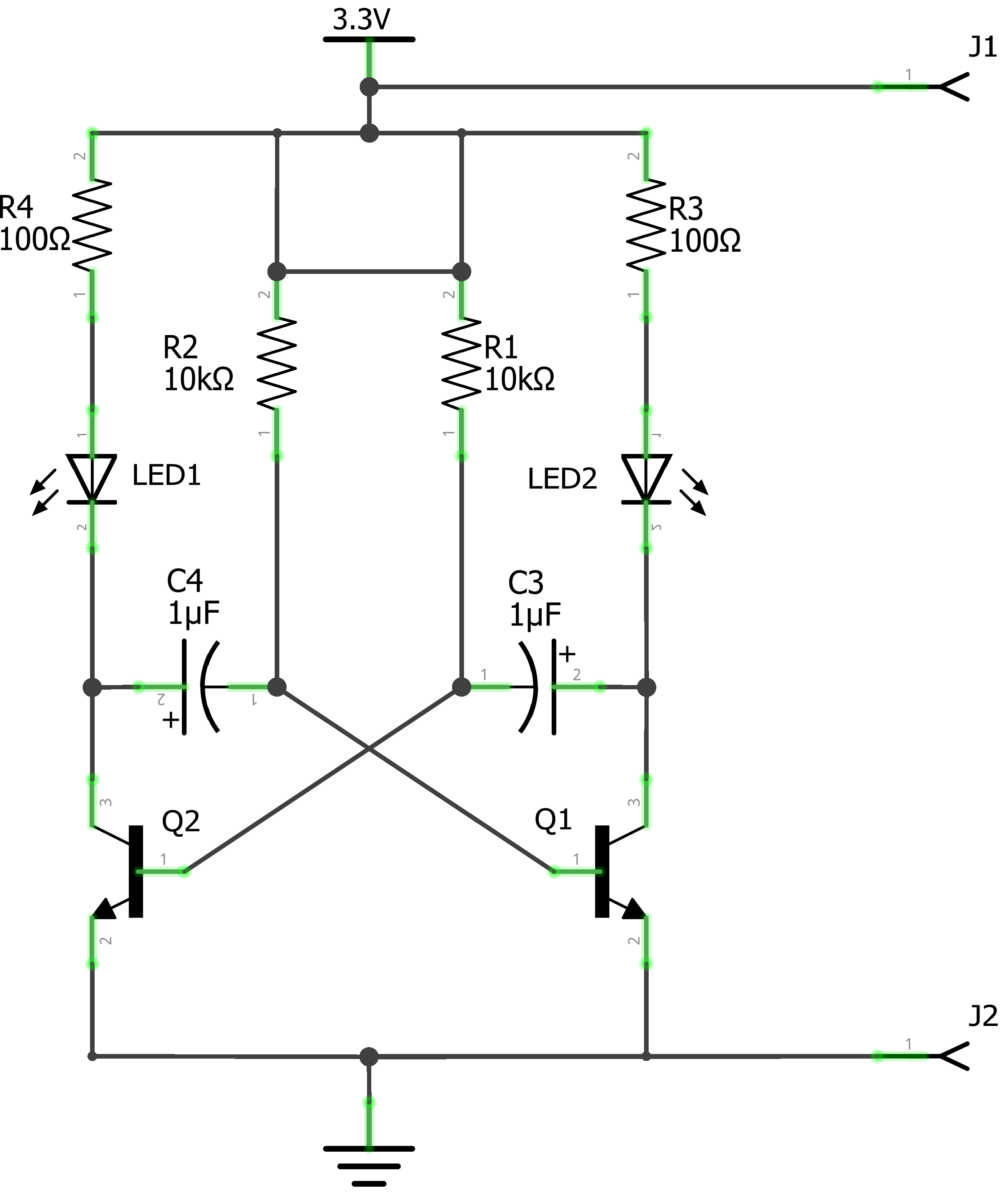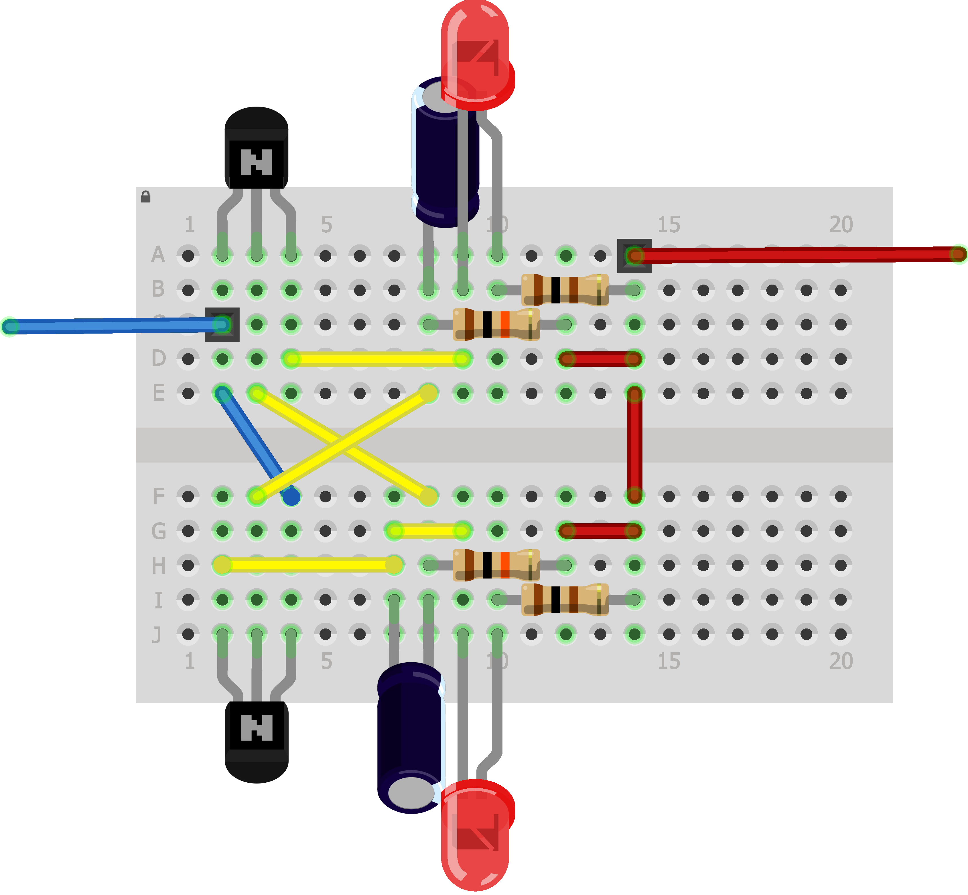 Bei der Astabilen Kippstufe werden Kondensatoren ge- und entladen. Dies geschieht abwechselnd - erst ist eine Hälfte der Schaltung aktiv, der Kondensator wird geladen. Erreicht er eine bestimmte Spannung, wird die andere Hälfte eingeschaltet, der Kondensator entlädt sich. Dieses abwechselnde Schalten sorgt für ein abwechselndes Blinken der LEDs. Abhängig von den verwendeten Widerständen und ElKos ändert sich die Frequenz des Blinkens.