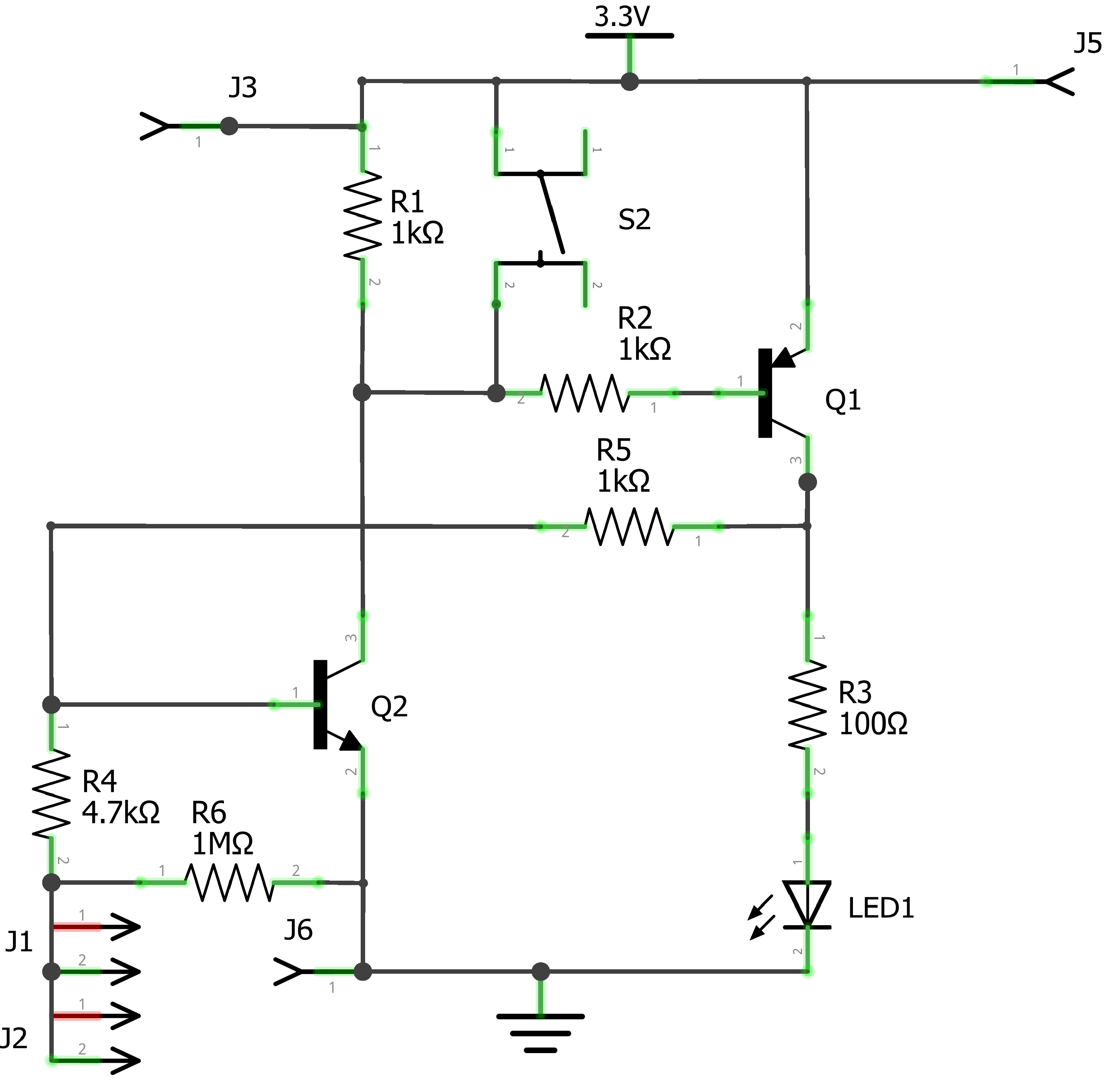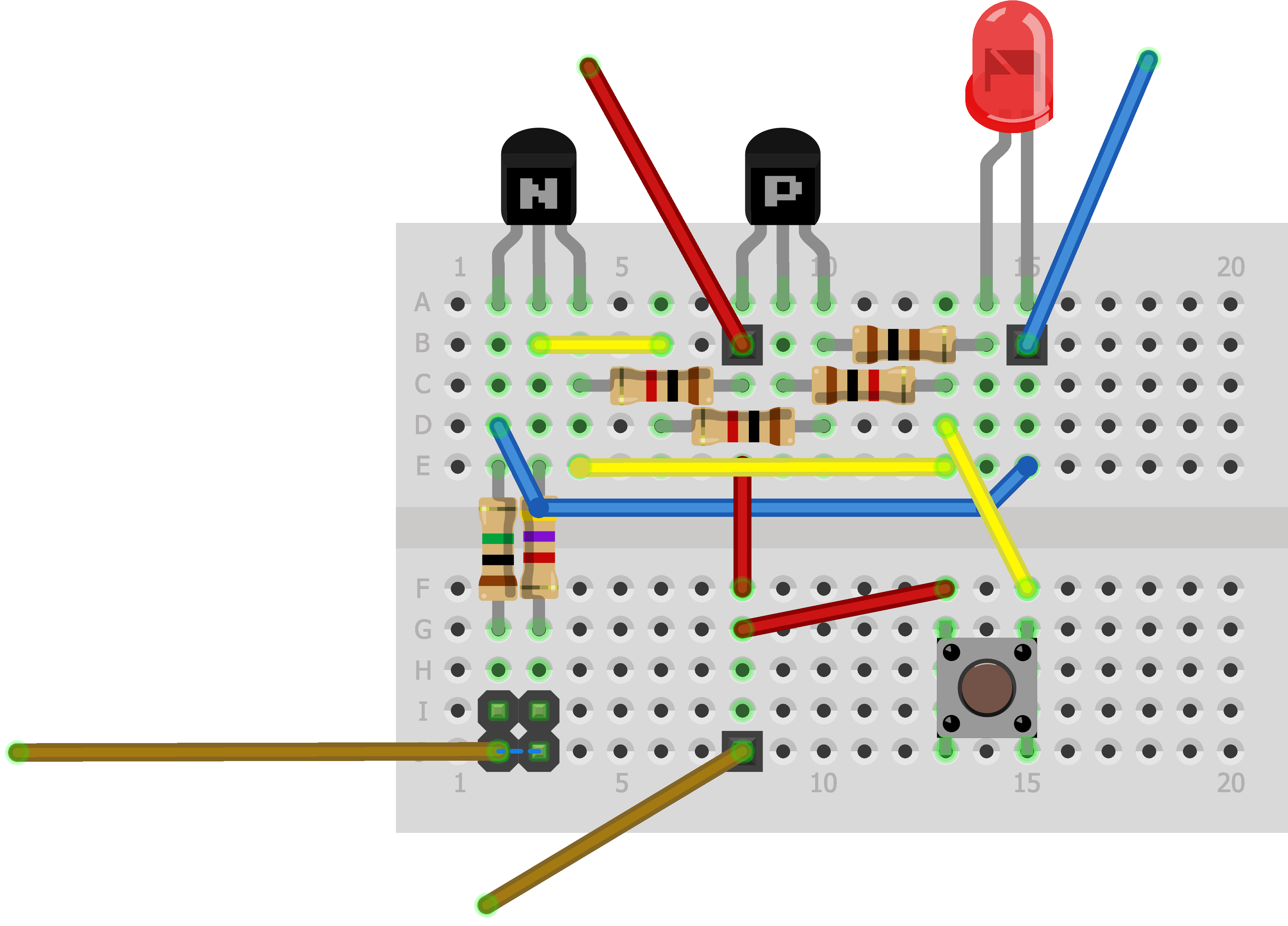 Für diesen Versuch wird eine Drahtschlaufe und ein langes Drahtstück benötigt. Die Schaltung besteht diesmal aus zwei Transistoren, einem pnp (BC557) und einem npn (BC547). Diese sind so kombiniert, dass die LED bei Berührung der beiden Drähte eingeschaltet wird und an bleibt. Diese Schaltung der Transistoren wird als Latch bezeichnet. Erst wenn der Taster gedrückt wird, setzt sich die Schaltung zurück und die LED erlischt.