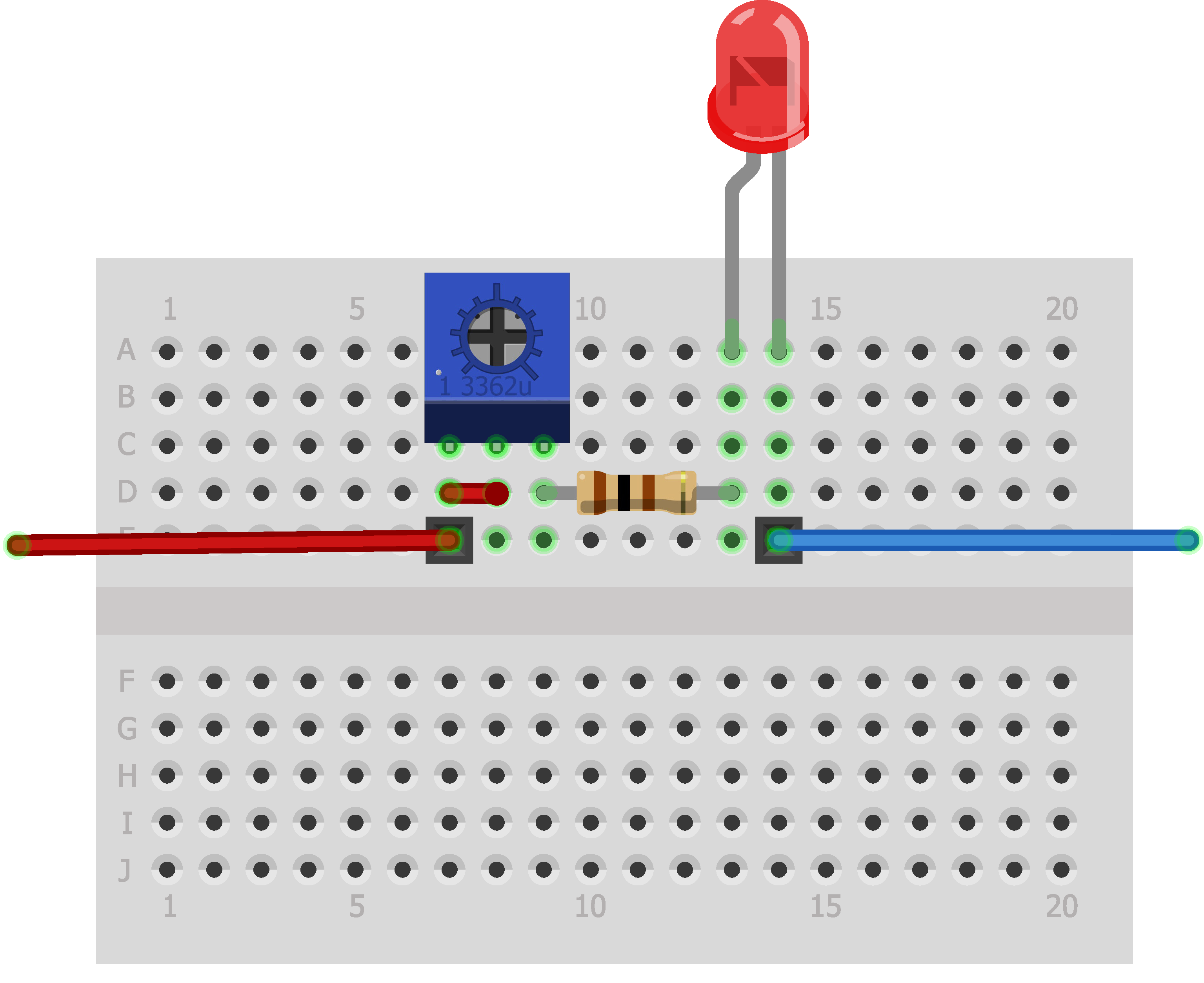 Eine LED wird mit einem Vorwiderstand betrieben. Dieser kann hier über das Potentiometer verändert werden. Dadurch ändert sich die Helligkeit der LED. Wenn du möchtest kannst du an dieser Schaltung schon mit dem Multimeter Messungen vornehmen.