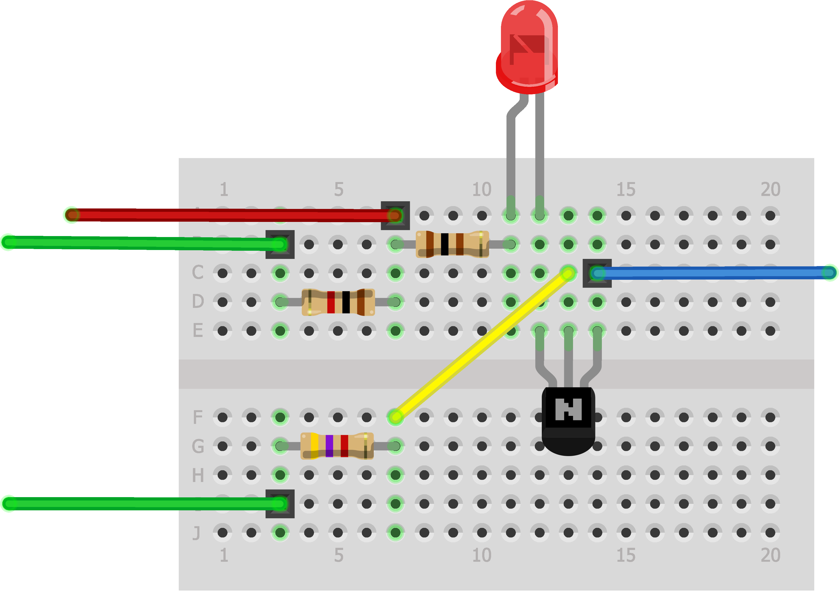 Sobald eine leitfähige Verbindung zwischen den grünen Kabeln besteht, leuchtet die LED. Wenn du möchtest kannst du an dieser Schaltung schon mit dem Multimeter Messungen vornehmen.