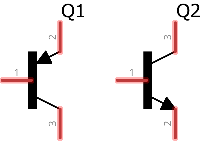 | Steckbrett Symbol - Die Beine sind Emitter, Basis und Kollektor. | Schaltplan Symbol - der Pfeil markiert den Emitter, links ist jeweils die Basis und unten der Kollektor. |